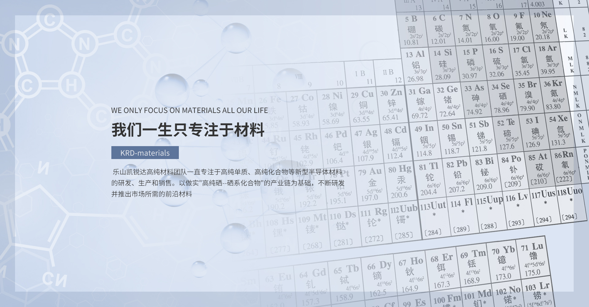 樂山凱銳達(dá)高純材料團(tuán)隊(duì)一直專注于高純單質(zhì)、高純化合物等新型半導(dǎo)體材料的研發(fā)、生產(chǎn)和銷售。以做實(shí)"高純硒--硒系化合物"的產(chǎn)業(yè)鏈為基礎(chǔ),不斷研發(fā)并推出市場所需的前沿材料。專業(yè)人才與技術(shù)方面的優(yōu)勢,為公司的技術(shù)創(chuàng)新、產(chǎn)品開發(fā)和產(chǎn)業(yè)化發(fā)展,打下了堅(jiān)實(shí)的基礎(chǔ)。至今,研制的高純材料多達(dá)300余種,在國內(nèi)高純領(lǐng)域處于領(lǐng)先地位。
